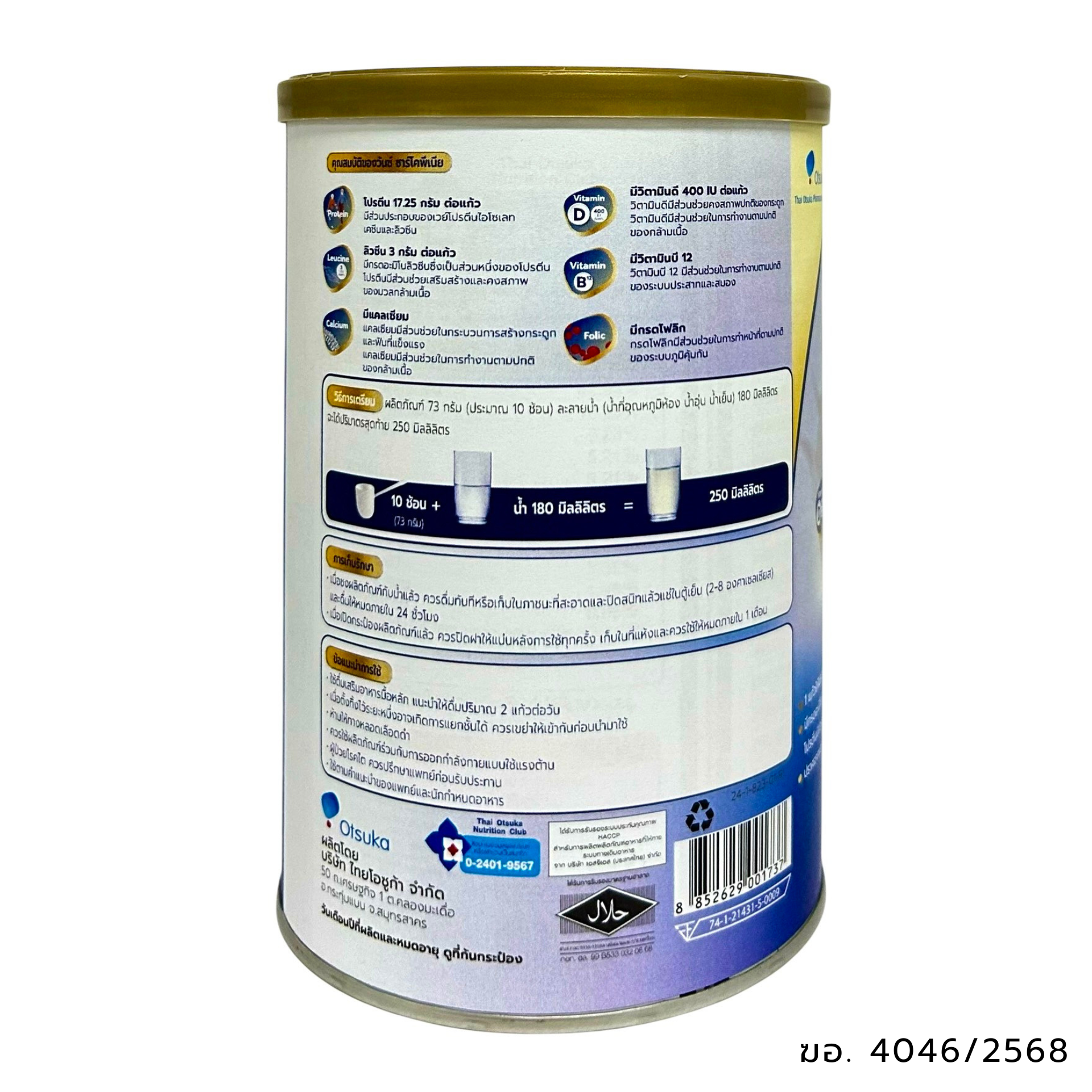 ผลิตภัณฑ์ 73 กรัม (ประมาณ 10 ช้อน) ละลายน้ำ (น้ำที่อุณหภูมิห้อง น้ำอุ่น น้ำเย็น) 180 มิลลิลิตร